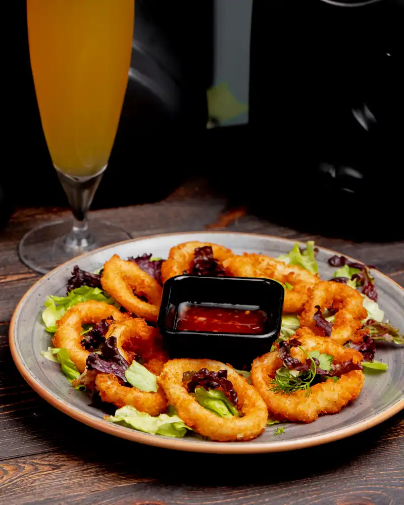 Calamari stir with onions and peppers tossed with onion,tomato sauce.